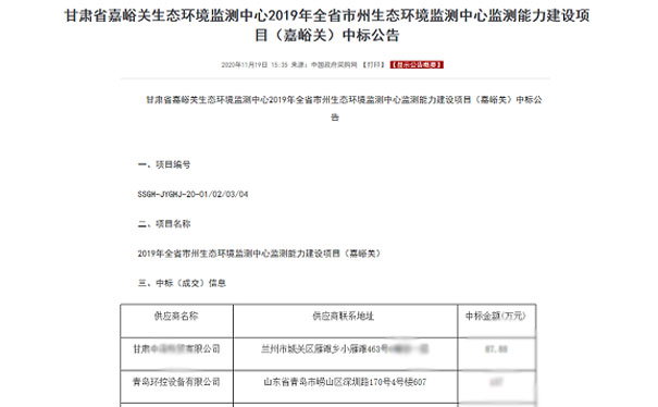 2020年11月19日,甘肅省嘉峪關(guān)生態(tài)環(huán)境監(jiān)測(cè)中心2019年全省市州生態(tài)環(huán)境監(jiān)測(cè)中心監(jiān)測(cè)能力建設(shè)項(xiàng)目(嘉峪關(guān))中標(biāo)公示,其中項(xiàng)目編號(hào):SSGH-JYGHJ-20-01/02/03/04,中標(biāo)供應(yīng)商:青島環(huán)控設(shè)備有限公司,中標(biāo)第三包。
