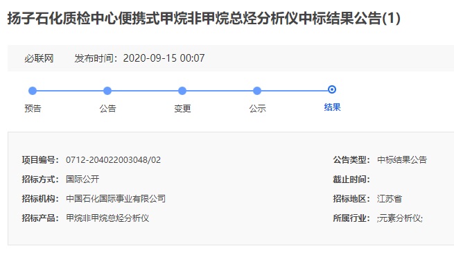 2020年9月15日揚(yáng)子石化質(zhì)檢中心便攜式甲烷非甲烷總烴分析儀中標(biāo)結(jié)果公示,招標(biāo)人:中國石化國際事業(yè)有限公司,項(xiàng)目編號為:0712-204022003048/02。本次江蘇省招標(biāo)產(chǎn)品為: 甲烷非甲烷總烴分析儀,招標(biāo)范圍:便攜式甲烷非甲烷總烴分析儀1臺,中標(biāo)人青島環(huán)控設(shè)備有限公司。